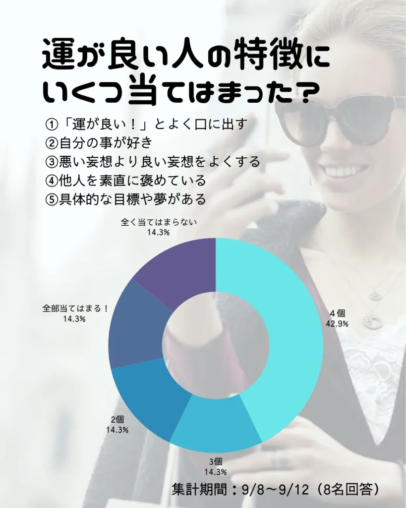 続いて、「運が良い人の特徴にいくつ当てはまるか?」というユニークなアンケートを実施しました。
